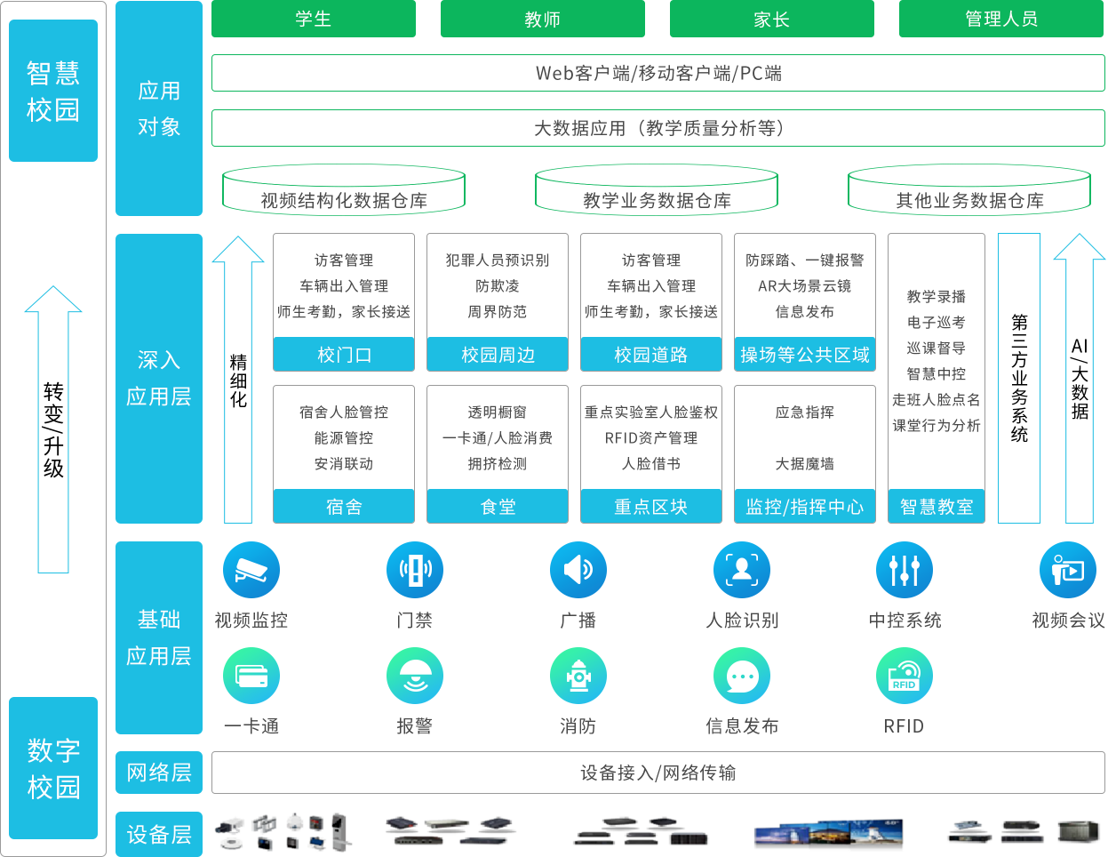 智慧校园一体化后台支持出入口人脸通行、周边安保监控、宿舍人脸管控及预警、校园AR云镜、透明厨房、楼道防踩踏等场景;