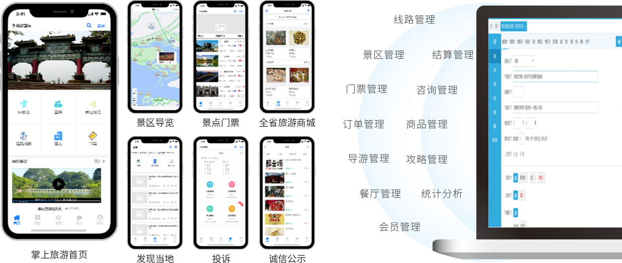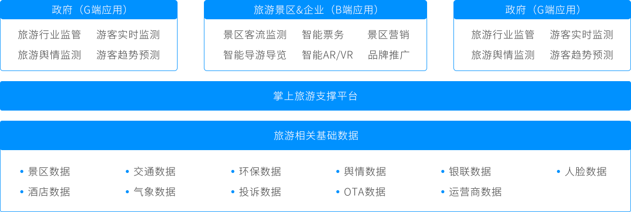 掌上旅游平台全面整合各类旅游资源,利用数据挖掘、AI等技术,对旅游景区、交通、酒店等数据进行全方位、多维度的分析,向政府、旅游景区&企业、游客提供旅游应用服务,将B/C/G 端紧密连接在一起,打造全域旅游生态圈。